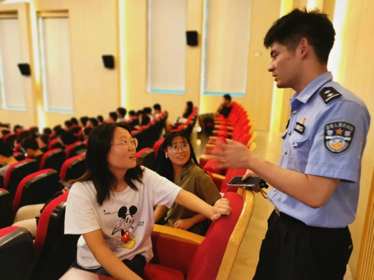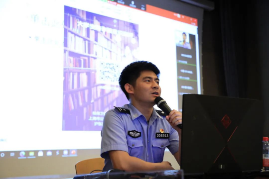 上海文保分局治安大队的俞天顺警官从高校高发的诈骗手法(冒充公检法、刷单兼职、冒充客服、冒充熟人、网购交易等)入手,例举了丰富的大学生受骗案例,为同学们敲醒警钟。讲座期间,俞警官假扮诈骗人员,与王同学互动模拟诈骗现场,为同学们上了生动的一课。