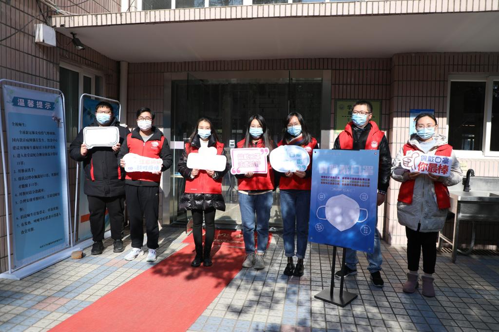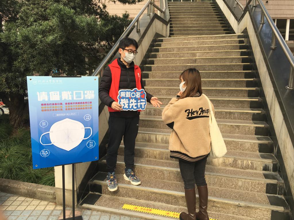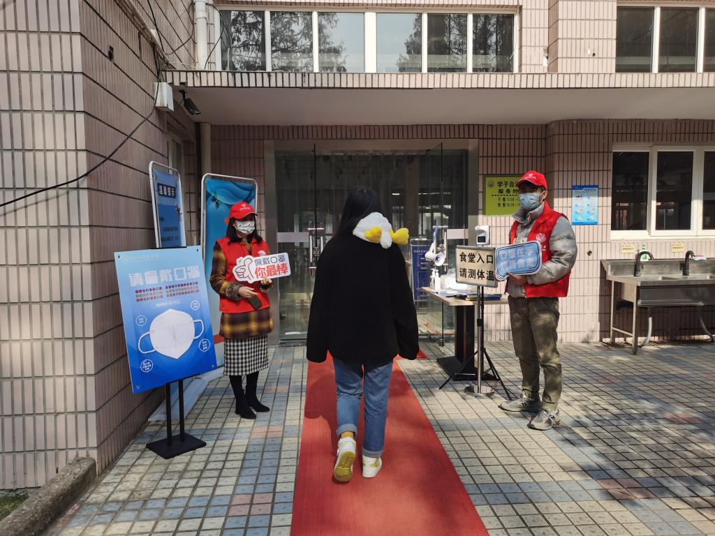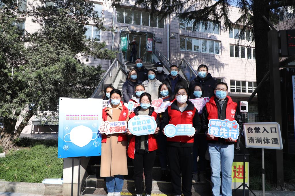 在本周内,太阳成集团tyc33455cc官网的师生志愿者们在沪西校区食堂门口,对佩戴口罩进入食堂的行为开展宣传教育。