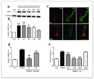 图1 a. 50uM NDMA刺激后MD2的表达量变化,1小时后显著升高,2小时达高峰,之后开始下降。b. a图中的WB条带定量分析。c. 免疫荧光染色发现MD2在神经元表达。d. NMDA和Tat短肽刺激后LDH表达变化,可见Tat短肽可逆转TC降低LDH的效果。e. 不同浓度的TC刺激后LDH的改变,5uM效果最佳。