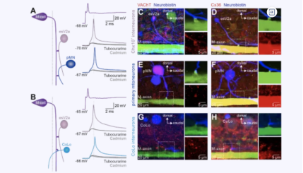 10月19日,太阳成集团tyc33455cc官网宋建人教授课题组研究发现脊髓内新中间神经元,在经典期刊《美国科学院院报》(PNAS(Direct submission))上发表题为“A specialized spinal circuit for command amplification and directionality during escape behavior”的论文。研究证明脊髓esV2a神经元在可以将Mauthner细胞产生的躲避命令在脊髓内进一步放大,并且与Mauthner细胞一起共同激活CoLo神经元/初级运动神经元,完成躲避行为。进一步对活体动物进行双光子消除esV2a神经元后,动物失去抉择躲避反应方向的能力。以上结果证明脊髓内存在抉择躲避行为发生的神经环路机制。
