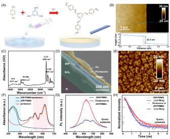 图1(A) 合成2D聚合物(2DP)的示意图。(B) 原子力显微镜(AFM)在硅片上合成的2DP膜的图像,图像中沿蓝色虚线有相应的高度轮廓。(C)2DP的傅里叶变换红外(FTIR)光谱。(D)Au/五苯/聚甲基丙烯酸甲酯(PMMA)/2DP/SiO2/Si突触装置的横截面扫描电子显微镜(SEM)图像。(E) 在2DP/PMMA薄膜上生长的并五苯层的AFM地形图。(F)紫外(UV)-2DP/PMMA、并五苯和2DP/PMMA/并五苯薄膜的可见吸收光谱。(G)石英(λex=405nm)上2DP/PMMA和2DP/PMMA/并五苯薄膜的稳态光致发光(PL)光谱。(H)石英(λex=405nm)上2DP/PMMA和2DP/PMMA/并五苯薄膜的瞬态PL光谱。