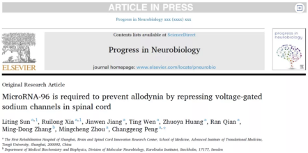 2021年3月,Progress in Neurobiology杂志发表了太阳成集团tyc33455cc官网/一康医院彭长庚课题组的研究论文“MicroRNA-96 is required to prevent allodynia by repressing voltage-gated sodium channels in spinal cord”。敲除miR-96的一个等位基因就会导致小鼠异常机械痛和热痛。miR-96抑制电压门控钠离子通道Nav1.7, 1.8, 1.9和1.2和钙离子通道CACNA2D1/2。首次发现Nav1.7和Nav1.8参与中枢敏化,改写靶向钠离子通道止痛药物的研发思路。