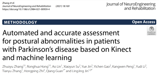 12月4日,靳令经团队在《神经工程与康复杂志》(Journal of NeuroEngineering and Rehabilitation)上发表了题目为:“Automated and accurate assessment for postural abnormalities in patients with Parkinson's disease based on Kinect and machine learning”的研究论文,该研究开发了一套基于 Kinect v2深度相机的帕金森病姿势异常智能评估系统,能够准确提取患者的姿势特征并对其严重程度进行自动评级,评估的人机一致性达0.94,准确度90.0%,灵敏度89.1%,特异度95.7%。同时,研究提出了评估帕金森病躯干前屈症的新方法——脊柱最凸点与躯干的距离。该研究为帕金森病姿势异常的评估提供了新方法,为解析其发生发展规律及机制奠定了基础。