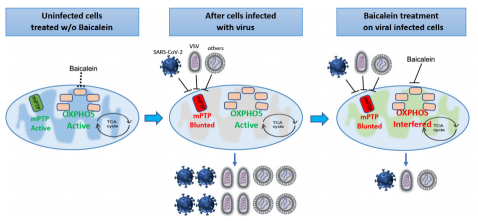 2020年11月,《 Signal Transduction and Targeted Therapy 》在线发表了题为“Baicalein inhibits SARS-CoV-2/VSV replication with interfering mitochondrial oxidative phosphorylation in a mPTP dependent manner ”的研究论文。该研究由施裕丰研究组、裴钢研究组和张波研究组合作完成。研究团队发现,Baicalein通过mptp依赖地抑制线粒体氧化磷酸化活性抑制新冠病毒复制。