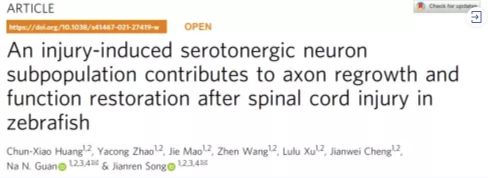 12月7日,宋建人团队在《自然·通讯》(Nature Communications)杂志上发表了题为“An injury-induced serotonergic neuron subpopulation contributes to axon regrowth and function restoration after spinal cord injury in zebrafish”的研究论文,该研究系统解析了脊髓中央模式产生器在脊髓损伤后的修复规律,揭示了脊髓内源性的五羟色胺参与的促进神经轴突再生修复的机制,并找到了参与该修复机制的靶受体,为脊髓损伤的基础研究和治疗提供了新思路。