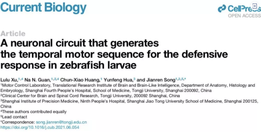 本研究以题目“Aneuronal circuit that generates the temporal motor sequence for thedefensive response in zebrafish larvae”与2021年7月20日(11a.m. ET)发表于经典期刊CurrentBiology。此研究揭示硬骨鱼类的神经系统通过将Mauthner细胞、颅中继神经元(CRNs)和内侧纵束核(nMLF)以特定的突触联接,形成神经信号单方向传递的链状神经环路构造;此链状神经环路构造赋予动物在危险情况下使用复杂的序列运动迅速改变运动方向,快速逃离危险源,大大提高生存几率的重要本能行为。本研究将为我们了解脊椎动物大脑控制序列运动行为提供依据。