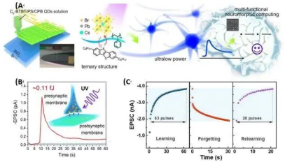 (A)类脑神经突触器件结构示意图;(B)类脑神经突触器件的低能耗特性;(C) 器件的记忆、遗忘与加速的再学习过程