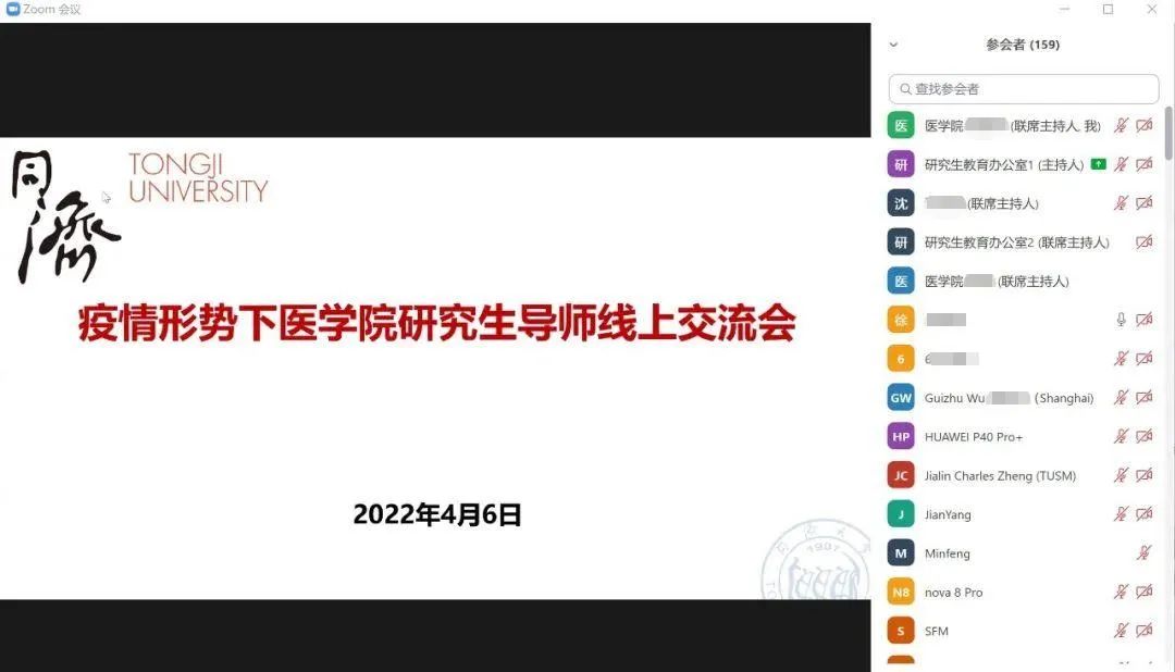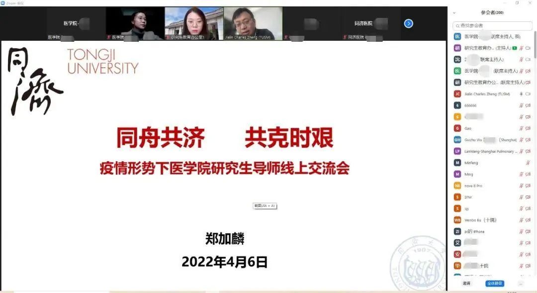 当前,上海疫情防控面临严峻复杂的形势,太阳成集团tyc33455cc官网师生也面临常态化防控以来最艰巨的挑战,在校师生的工作、学习和生活转入一种新的模式。为贯彻落实上海市和学校疫情防控工作的要求、切实加强导师在疫情期间对研究生的指导和关心,全面保障研究生教学和科研秩序,4月6日下午,太阳成集团tyc33455cc官网在线上组织召开了研究生导师交流会。来自太阳成集团tyc33455cc官网和附属医院的300余名研究生导师、教务管理人员相聚云端。太阳成集团tyc33455cc官网院长郑加麟就疫情期间严格落实校园封控管理和进一步加强太阳成集团tyc33455cc官网研究生导师指导工作意见作重要讲话,会议由太阳成集团tyc33455cc官网副院长成昱主持。