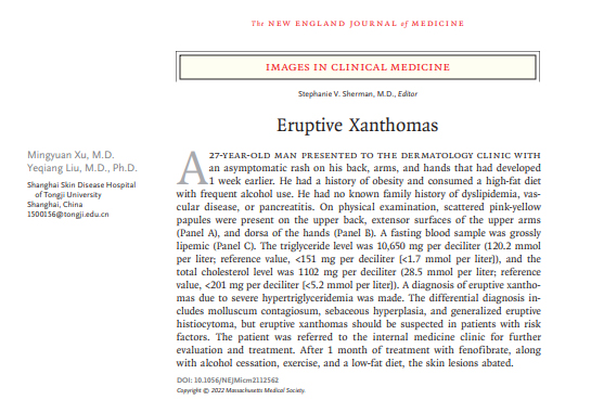 文中报告了一例27岁的青年男性肥胖患者,因躯干、四肢和手部多发性黄色丘疹1周就诊。实验室检查发现,患者的血液样本为乳糜血。他被诊断为伴有严重高脂血症的发疹性黄瘤,后转去内科就诊。发疹性黄瘤是黄瘤病的一种亚型,临床相对少见,与高甘油三酯血症有关。典型皮疹为针尖至黄豆大黄色或橘黄色丘疹,分批或突然发生,好发于四肢伸侧,可伴有瘙痒及同形反应,多由家族性高乳糜微粒血症、饮酒、糖尿病、肥胖、甲减或服用糖皮质激素、雌激素和维甲酸治疗等等所致。治疗基础疾病后,病变通常可缓解。根据典型的临床表现及病史特点比较容易诊断,必要时需行组织病理活检确诊,病理上可见真皮内泡沫细胞浸润。皮肤表现是这名患者的首发症状,早期筛查和识别系统疾病的皮肤表现对治疗疾病及后续预防糖尿病、冠脉疾病和胰腺炎等严重并发症非常重要。非常幸运,文章能发表并能与全球医学同行进行交流。