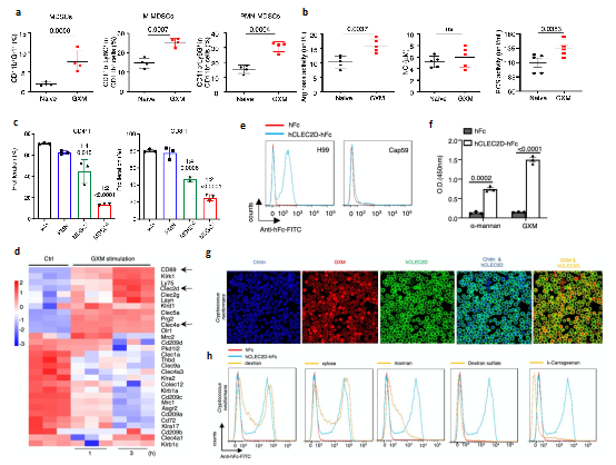 进一步的研究表明,隐球菌主要荚膜多糖成分GXM是诱导PMN-MDSCs聚积的关键成分,并可以通过增加MDSCs精氨酸酶-1(Arg-1)的表达来抑制T细胞增殖及功能(图2a-c)。为明确GXM的识别受体及下游信号通路,分析发现GXM处理MDSCs后C型凝集素受体Clec2d表达显著上调,并通过构建Clec2d受体胞外段与人Fc段融合蛋白(hCLEC2D-hFc)与隐球菌共培养、多糖竞争性结合、Clec2d胞外段截断体结合、氨基酸位点突变等实验多方面证实Clec2d可特异性识别GXM(图2d-h)。这些数据证实了GXM诱导PMN-MDSCs中Arg-1的表达是引起免疫抑制效应的重要分子,并进一步寻找到特异性识别GXM的关键性受体Clec2d。