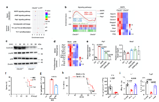 为进一步明确GXM引起隐球菌感染免疫抑制的内在机制,研究者构建了Clec2d基因敲除小鼠(Clec2d-/-),同时对比野生型WT小鼠骨髓来源MDSCs的转录组,KEGG通路富集与GSEA分析均表明MAPK通路变化显著,Clec2d-/-小鼠中p38通路激活被抑制,且使用p38抑制剂可显著降低MDSCs表达Arg-1(图3a-e)。同时,利用p38小分子抑制剂SB202190治疗小鼠肺部隐球菌感染,可显著提高小鼠生存率并降低肺部荷菌量;更有意义的是,研究者筛选了597种非专利口服药物,发现凡德他尼可体外抑制GXM诱导的p38通路激活,体内实验证明该药物同样可以显著提高隐球菌感染后小鼠存活率,促进隐球菌的清除,显著提高Th1及Th17细胞比例与功能(图3f-i)。以上结果表明GXM通过CLEC2D-p38-ARG-1信号轴激活MDSCs免疫抑制功能,同时为干预p38通路抑制ARG-1的表达从而抗新型隐球菌感染免疫治疗策略提供了理论依据。