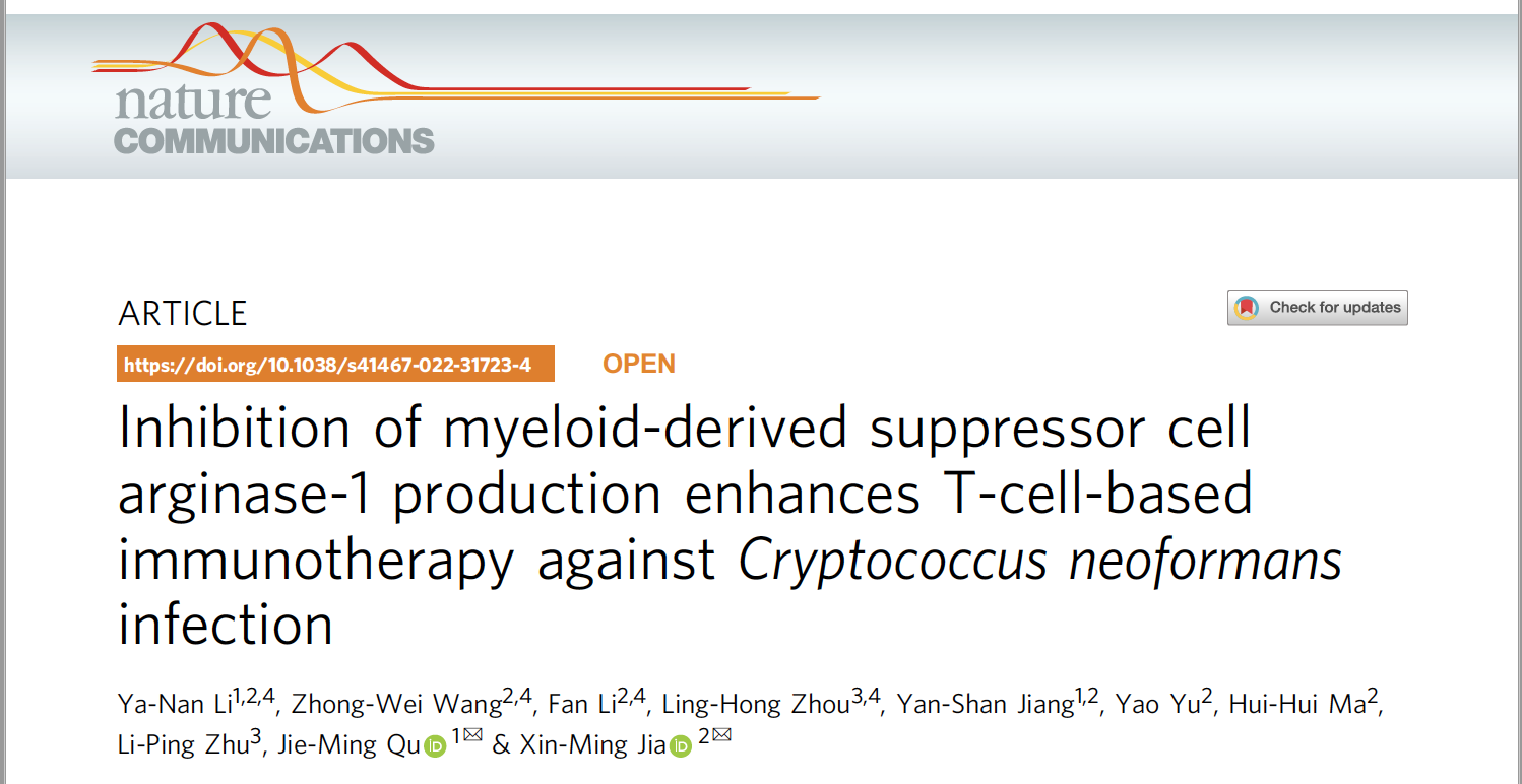 2022年7月14日,太阳成集团tyc33455cc官网附属第十人民医院贾鑫明教授、上海交通大学太阳成集团tyc33455cc官网附属瑞金医院瞿介明教授课题组合作在Nature Communications上发表了题为“Inhibition of myeloid-derived suppressor cell arginase-1 production enhances T-cell-based immunotherapy against Cryptococcus neoformans infection”的研究。该研究揭示了新型隐球菌主要荚膜多糖成分葡聚糖醛木糖甘露聚糖(glucuronoxylomannan, GXM)通过诱导机体粒细胞样髓系来源免疫抑制性细胞(PMN-MDSCs)的聚积及功能抑制机体对隐球菌的清除,加重感染。并通过进一步鉴定GXM的识别受体及下游通路为抗隐球菌感染提供了新的潜在免疫治疗靶点与策略。瑞金医院助理研究员李亚男博士、太阳成集团tyc33455cc官网附属第十人民医院助理研究员王中伟博士、太阳成集团tyc33455cc官网博士研究生李帆、华山医院博士研究生周泠宏为该论文的共同第一作者。本研究得到了国家重点研发计划,国家自然科学基金以及上海市科委基金的资助支持。
