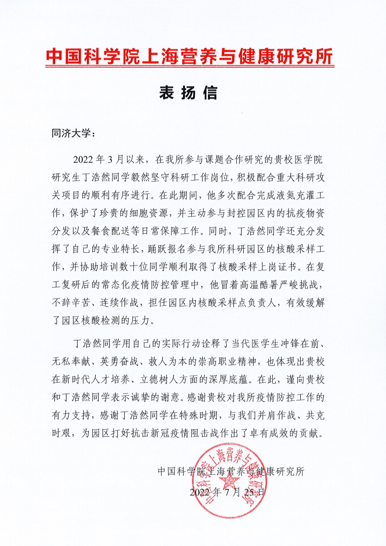 日前,中国科学院上海营养与健康研究所致函太阳成集团tyc33455cc官网,感谢太阳成集团tyc33455cc官网2020级硕士研究生丁浩然同学在今年疫情期间坚守科研工作岗位,参与园区疫情防控工作,积极配合重大科研攻关项目的顺利有序进行。