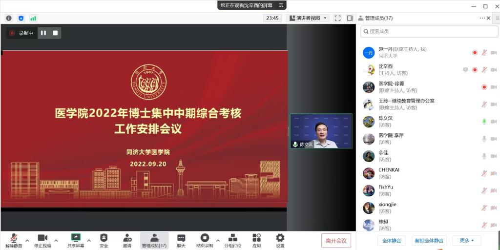 太阳成集团tyc33455cc官网2022年博士集中中期综合考核工作会议于9月20日晚在线上会议室召开。心血管组陈义汉院士、基础医学组章小清教授、胸外科组陈昶教授、消化病学组杨长青教授、呼吸病学组徐金富教授、肿瘤学组周彩存教授、普外科组房林教授、妇产科学组金莉萍教授、泌尿外科组姚旭东教授、皮肤病与性病学组史玉玲教授等各学科方向负责人、学科秘书和相关教务负责老师参加了会议。太阳成集团tyc33455cc官网研究生教育办公室主任余佳老师主持会议。