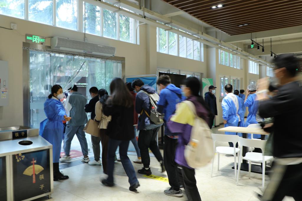 沪西校区的师生们分别进入食堂的一层和二层模拟火灾现场逃生演练。沪北校区的师生们在教室集体观看学习了消防安全的相关视频。