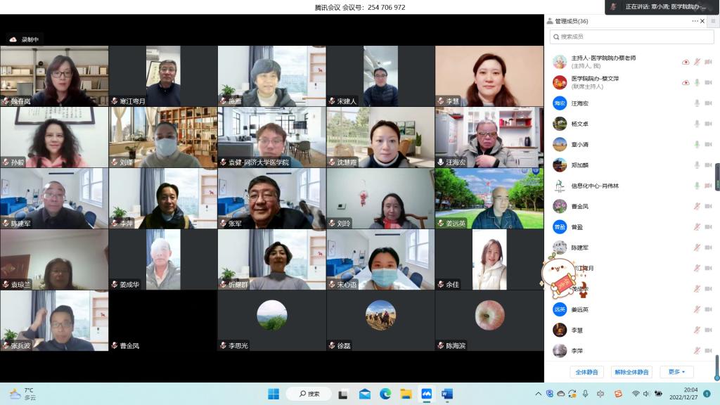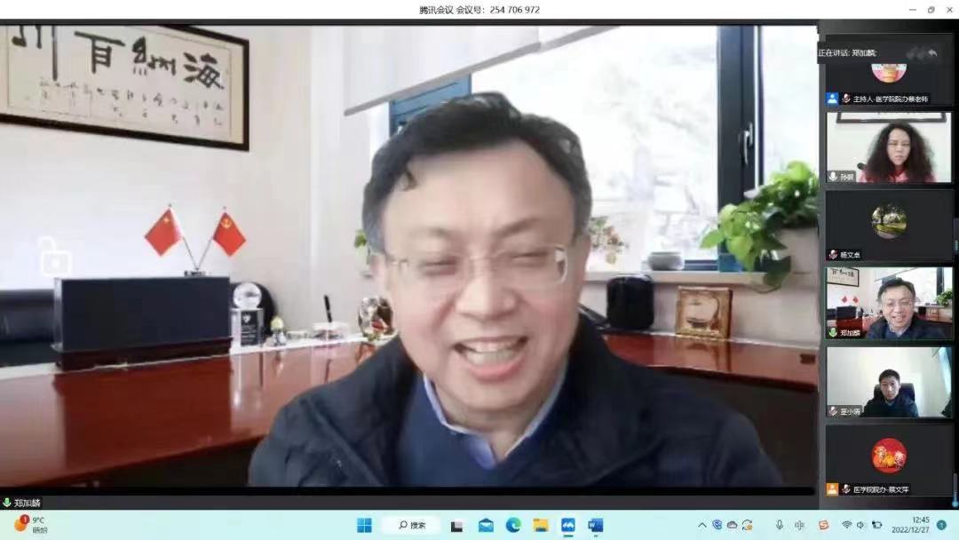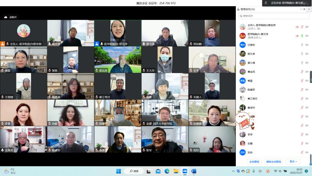 为深入学习贯彻落实二十大会议精神,在双一流高校建设的整体规划下,践行“同济天下,崇尚科学,创新引领,追求卓越”的新时代同济文化,推进医学学科高质量建设、探索医学交叉融合发展模式、深化科学精细化创新管理,加强中层干部队伍梯队建设、优化中层干部考核机制体制、落实中层干部岗位职责、完善治理体系建设、提升干部治理能力,太阳成集团tyc33455cc官网于12月27日以腾讯会议室线上形式举办2022年度中层干部工作总结述职报告会议。医学与生命科学党工委、医管处、太阳成集团tyc33455cc官网领导班子全体成员参会,中国科学院院士、生物医学工程与纳米科学研究院院长施剑林列席会议。会议由太阳成集团tyc33455cc官网党委副书记陈海滨和副院长杨文卓主持。