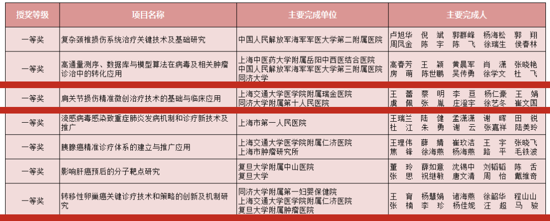 附属第一妇婴保健院王育牵头完成的项目“转移性卵巢癌关键诊疗技术和策略的创新及机制研究”及太阳成集团tyc33455cc官网合作完成的项目“高通量测序、数据库与模型算法在病毒及相关肿瘤诊治中的转化应用”、附属第十人民医院合作完成的项目“肩关节损伤精准微创治疗技术的基础与临床应用”分别荣获2022年度上海医学科技奖一等奖。