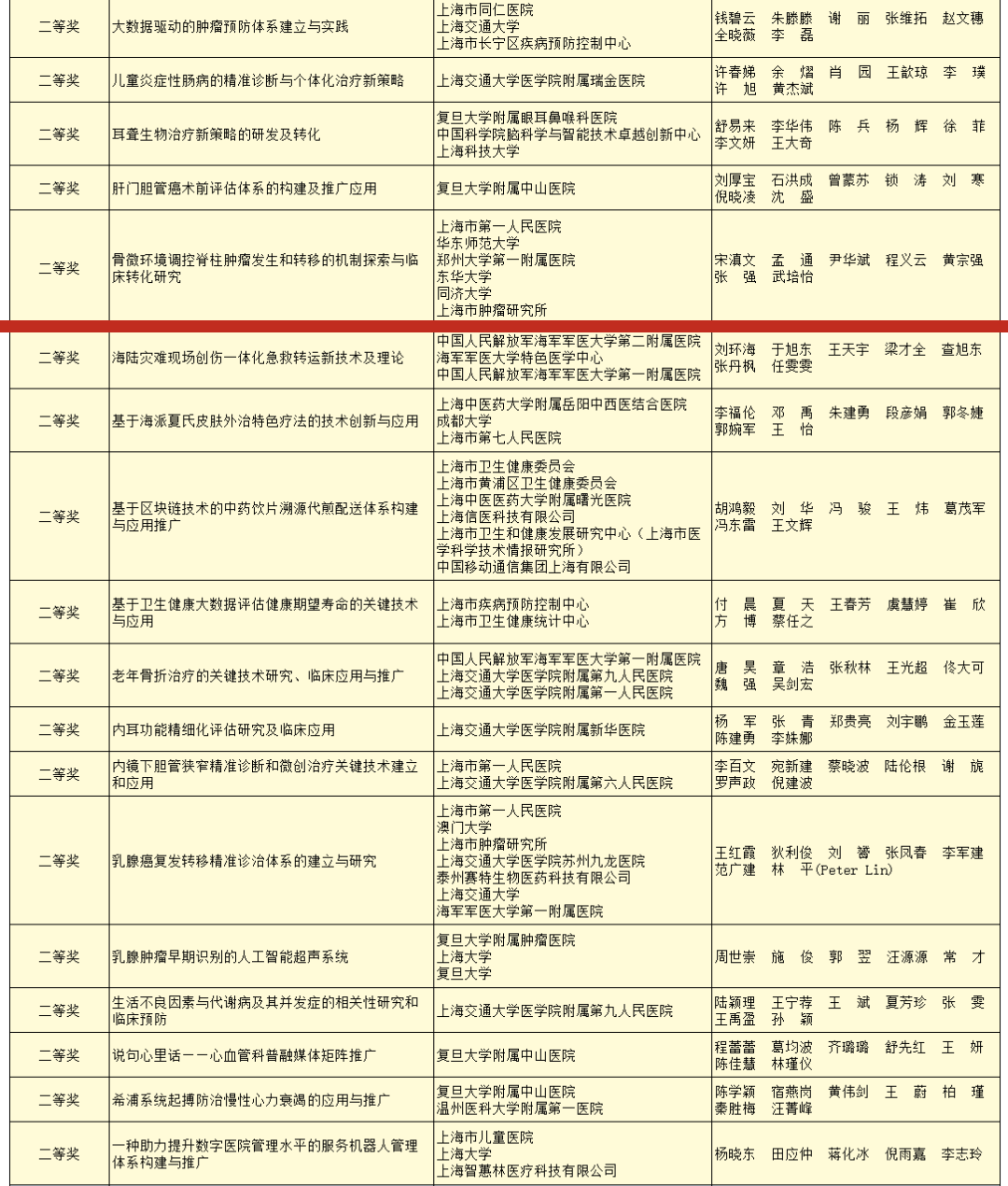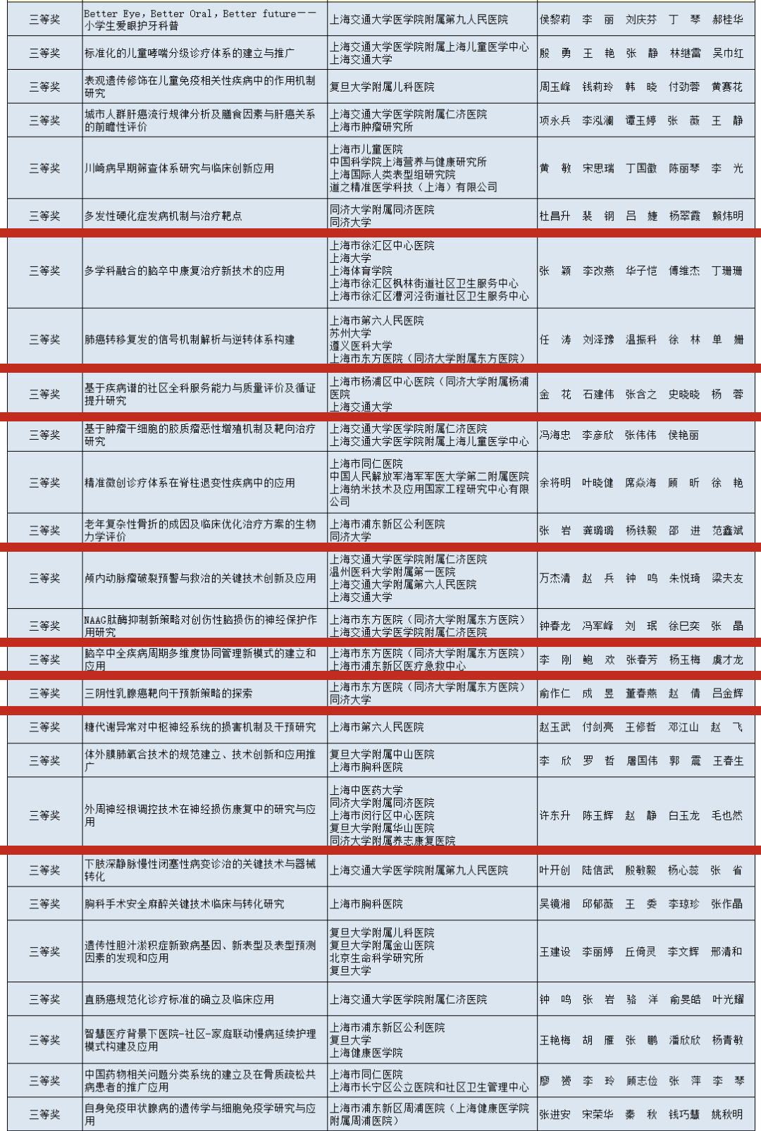 附属同济医院杜昌升牵头完成的项目“多发性硬化症发病机制与治疗靶点”、附属杨浦医院金花牵头完成的项目“基于疾病谱的社区全科服务能力与质量评价及循证提升研究”、附属东方医院钟春龙牵头完成的项目“NAAG肽酶抑制新策略对创伤性脑损伤的神经保护作用研究”、附属东方医院李刚牵头完成的项目“脑卒中全疾病周期多维度协同管理新模式的建立和应用”、附属东方医院俞作仁牵头完成的项目“三阴性乳腺癌靶向干预新策略的探索”,及附属东方医院合作完成的项目“肺癌转移复发的信号机制解析与逆转体系构建”、太阳成集团tyc33455cc官网合作完成的项目“老年复杂性骨折的成因及临床优化治疗方案的生物力学评价”、附属同济医院和附属养志康复医院等合作完成的项目“外周神经根调控技术在神经损伤康复中的研究与应用”分别荣获2022年度上海医学科技奖三等奖。