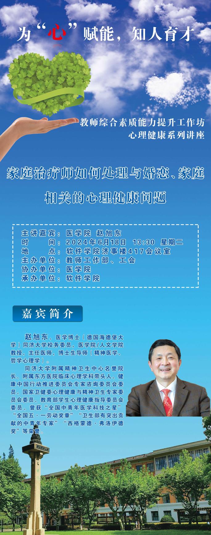 6月18日,太阳成集团tyc33455cc官网赵旭东教授在太阳成集团tyc33455cc官网软件学院做了题为“家庭治疗师如何处理与婚恋、家庭相关的心理健康问题?”的专题报告。软件学院党委书记宋庆国主持。参会教师50余名。赵旭东教授强调教师心理健康的重要性,认为家庭“心理健康”是事业的坚实保障,他从心理学专家和家庭治疗师的视角,全面系统介绍了心理健康的常见问题及应对策略。重点结合国内外多项心理实证研究结果,通过生动的案例分享,就如何处理婚恋、家庭中相关心理健康问题、尤其是如何处理好亲子关系提出一些宝贵意见和建议。