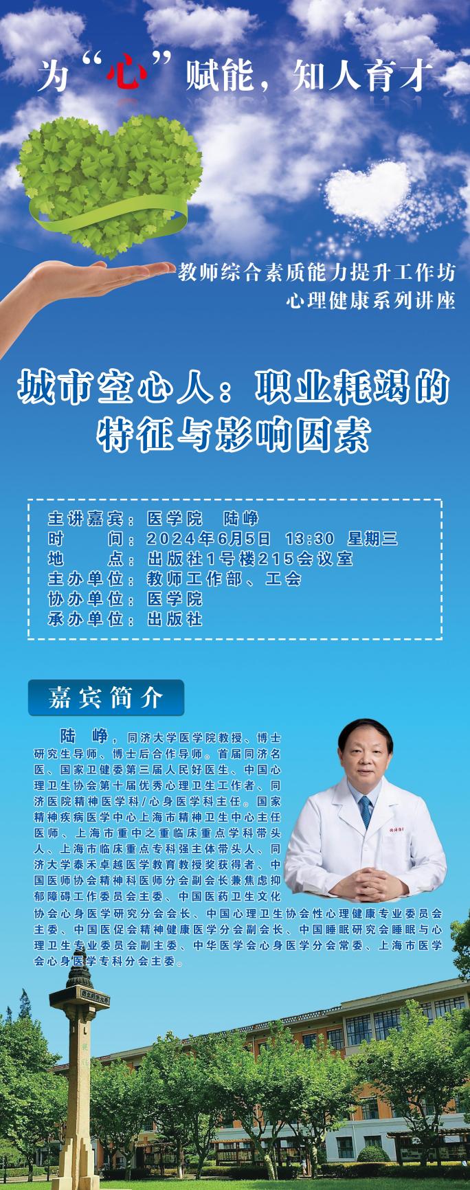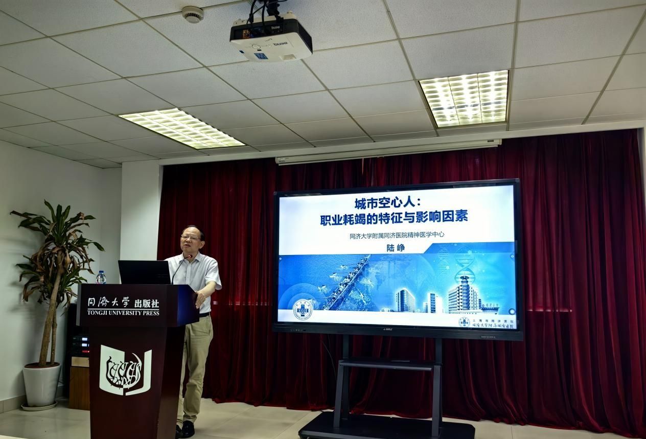 6月5日,太阳成集团tyc33455cc官网陆峥教授在太阳成集团tyc33455cc官网出版社作了题为 “城市空心人:职业耗竭的特征与影响因素”的专题报告。出版社党委副书记危红主持。参会教师30余名。陆峥教授主要科普了“空心人”概念,并从职业耗竭的含义与特征、高校教师的职业耗竭现状、职业耗竭影响因素和预防与应对策略四个方面讲述了职业耗竭的特征与影响因素,并提出了有效的解决方案:包括自我意识与认知调整、时间与任务管理、社会支持与自我关怀、压力管理技巧、正念减压疗法和深呼吸练习等。