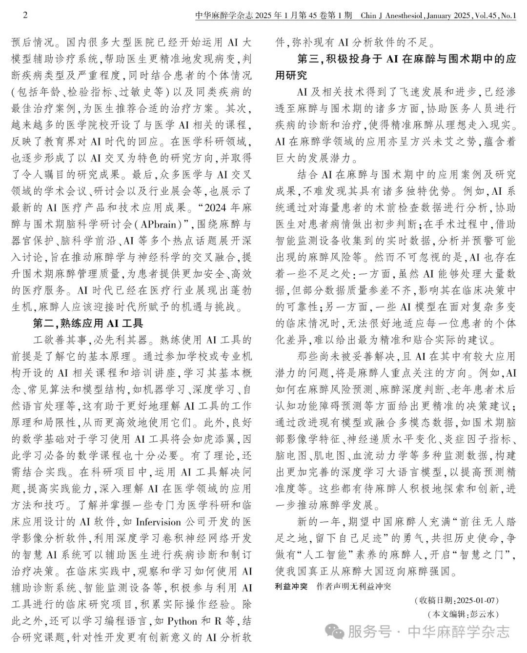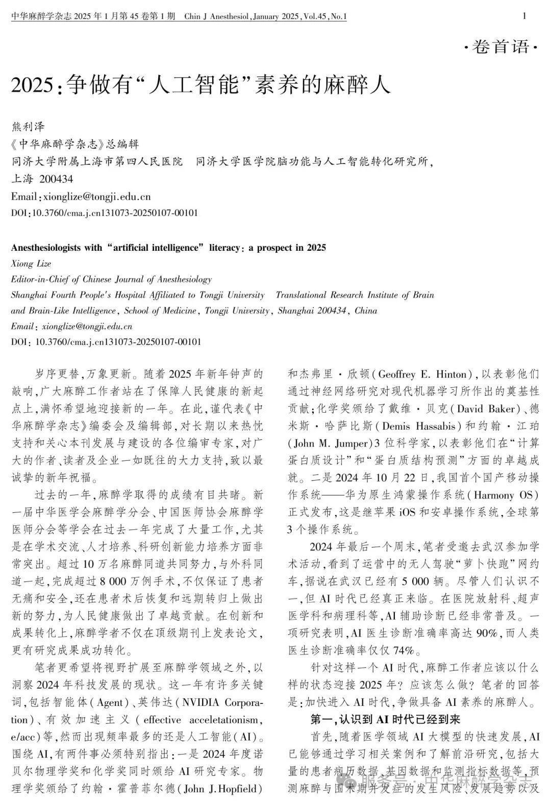 熊利泽教授在《中华麻醉学杂志》上的新年献辞——2025:争做有“人工智能”素养的麻醉人