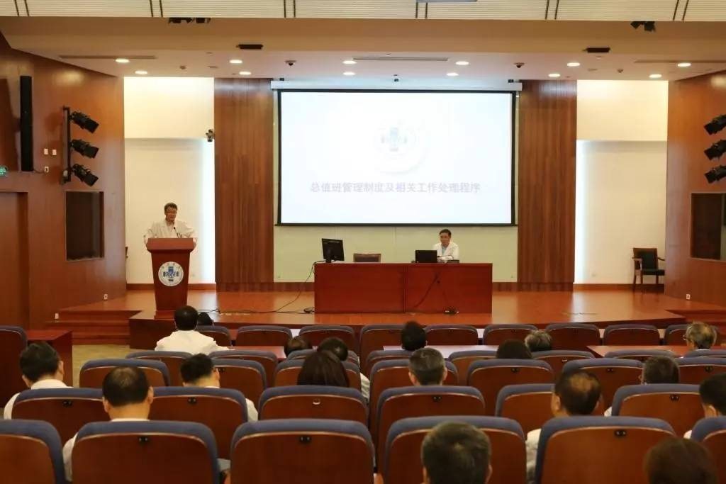 培训会上,王培军副院长对院部关于增加临床科主任等骨干参与总值班的决定做了详细说明。该决定将有助于提升总值班的管理力量和水平,有助于提高科主任行政管理能力,有助于行政职能部门与临床科室之间的工作协调。就《总值班管理办法》、《总值班岗位职责》、《总值班相关工作处理程序》等具体内容,王培军副院长做了详细的培训和指导,对与会的科主任和行政总值班的责任意识进行了强调,并对交接班提出了更高的要求。他指出,值班人员必须熟知相关规章制度,切实履行岗位职责,对交办事项的始末跟进了解,重要事件当面交接。