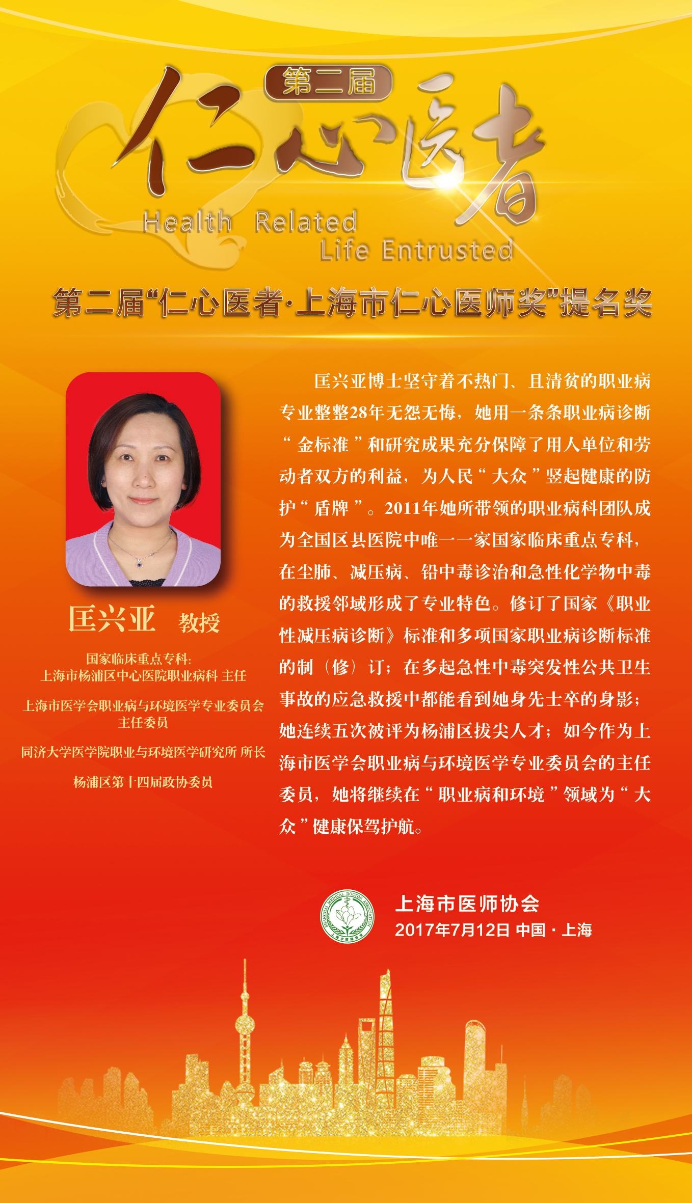 我院职业病科主任匡兴亚荣膺上海市第二届仁心医师奖提名奖