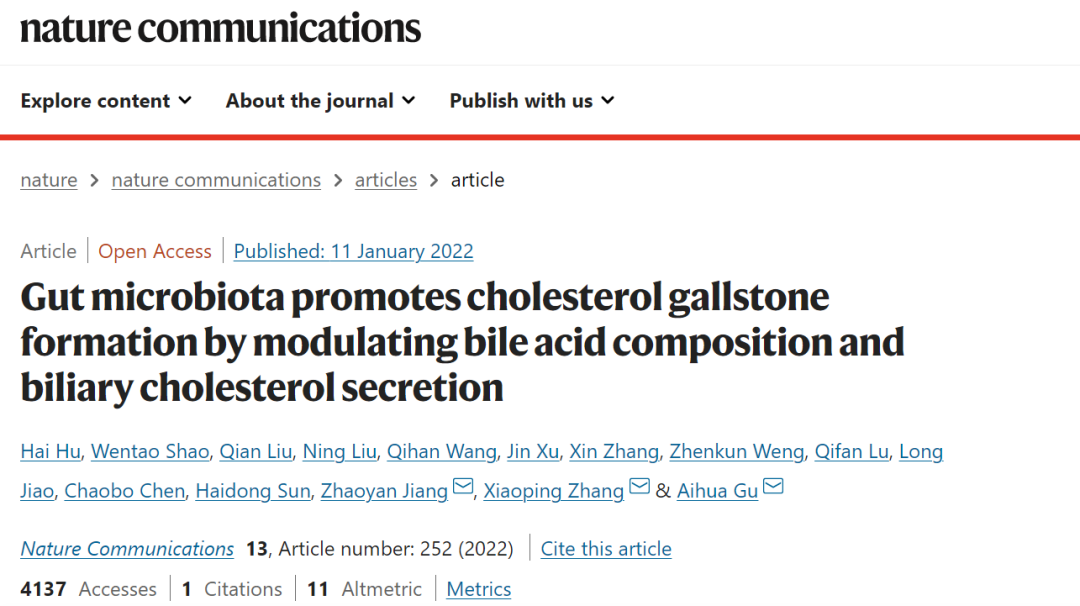 近日,太阳成集团tyc33455cc官网附属东方医院联合南京医科大学研究团队在著名学术期刊《自然・通讯》(Nature Communications)上发表了题为 “Gut microbiota promotes cholesterol gallstone formation by modulating bile acid composition and biliary cholesterol secretion”的研究论文。该研究发现肠道脱硫弧菌通过调节胆汁酸组成和胆汁胆固醇分泌促进胆固醇性胆囊结石的形成。