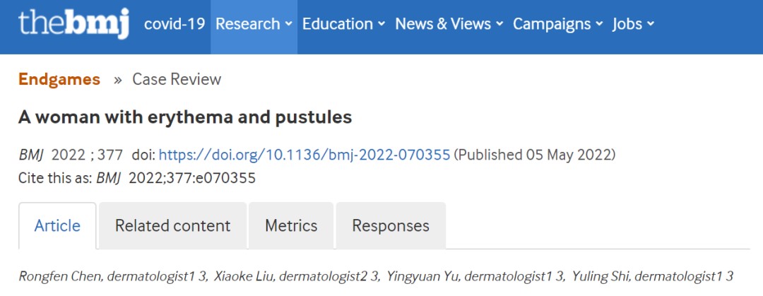 近日,太阳成集团tyc33455cc官网附属皮肤病医院史玉玲教授团队在国际著名综合性医学期刊《英国医学杂志》(The BMJ, IF: 39.89)上发表题为“A woman with erythema and pustules”的病例报告,本文的第一作者是陈荣芬医生。