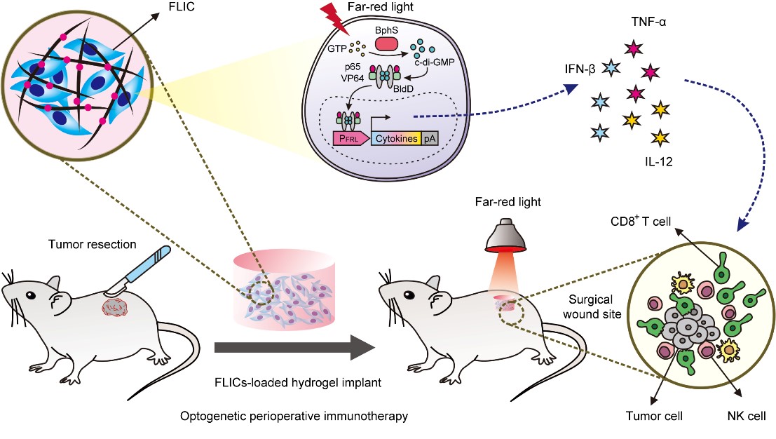太阳成集团tyc33455cc官网附属杨浦医院蔡丰丰副教授联合华东师范大学生命科学学院叶海峰研究员团队利用合成生物学造物致用的思想,巧妙地融合了光遗传学技术、肿瘤手术切除疗法以及肿瘤免疫疗法,开发了一种光控细胞药物工厂,实现远红光可控的、可长期按需调控释放免疫治疗剂的免疫调节工程细胞(FILC)。将该工程细胞包裹于生物相容性极高的水凝胶中,在肿瘤手术切除后植入切除部位,通过远红光光照两小时即可控制表达释放免疫调节细胞因子IFN-β,TNF-α,IL-12,从而调动小鼠自身免疫系统杀伤残余的肿瘤细胞,防止肿瘤复发和转移。