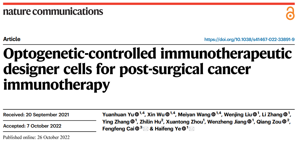 上述研究成果于10月26日发表在Nature Communications期刊上,题为:“Optogenetic-controlled immunotherapeutic designer cells for post-surgical cancer immunotherapy”,该研究开发的远红光调控的新型肿瘤免疫疗法既可以解决肿瘤手术切除疗法易复发和转移的问题,也可以避免肿瘤免疫疗法起效慢以及不可控性产生的非特异性过度激活问题,显著地提高肿瘤手术切除治愈率。该疗法开启了免疫抗癌新思路,同时也扩展了光遗传学技术在生物医学领域的应用,具有潜在的临床转化意义。