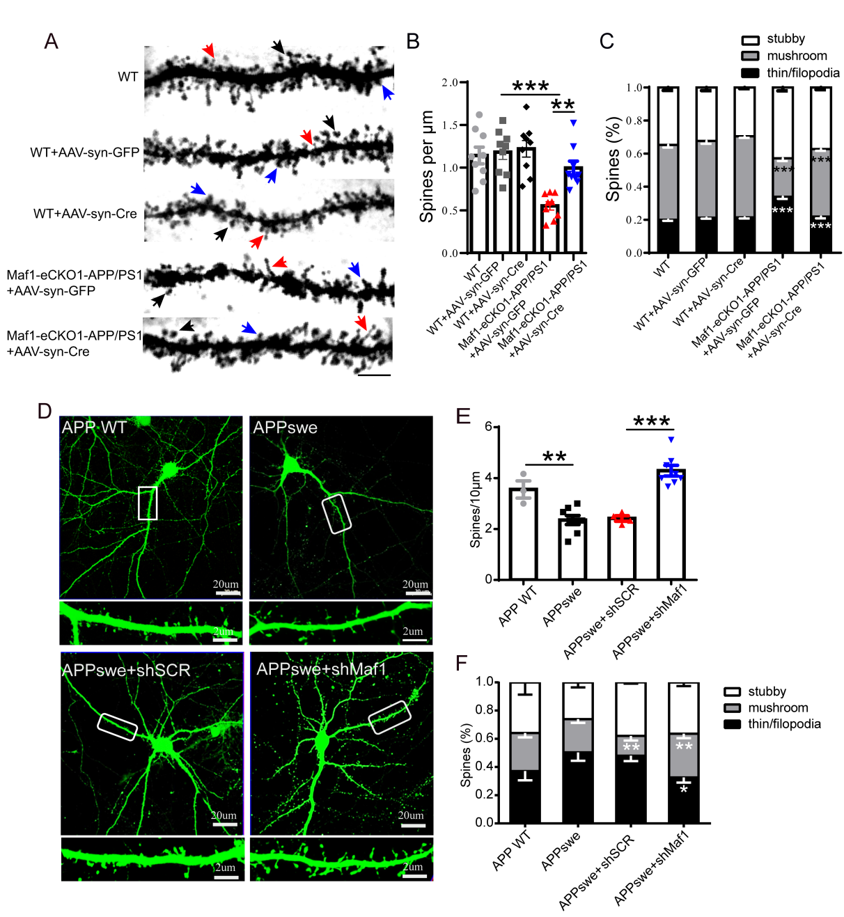 研究人员发现在AD转基因小鼠及体外AD模型中,条件性敲除Maf1后神经元树突棘总数量明显增多,而且成熟树突棘的百分比的比例也明显提高,这说明Maf1在AD疾病中对神经元树突的形态具有调控作用(图3)。