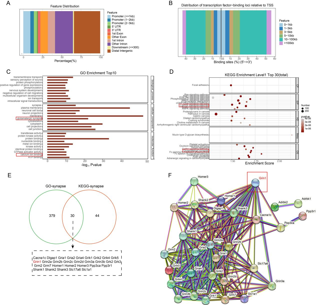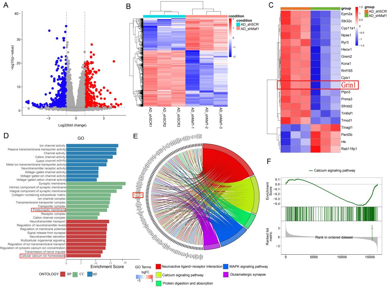 CUT&Tag实验进一步探讨了Maf1在AD中调节突触重塑的机制(图6)。GO分析和KEGG分析表明突触与钙离子信号通路和谷氨酸突触密切相关。通过蛋白相互作用网,发现Grin1位于核心位置,这表明Maf1-NMDAR1可能通过调节AD中钙稳态来调节突触功能。