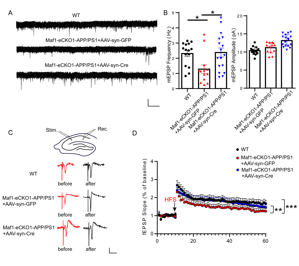 然而,这种形态的恢复是否能改善神经生理功能障碍吗?因此,研究人员进一步检测了小鼠海马突触可塑性的变化,观察到AD小鼠海马神经元中mEPSC的频率降低,而敲减了Maf1后恢复到WT水平。因此,研究人员认为条件性敲除Maf1可以恢复海马突触可塑性(图4)。