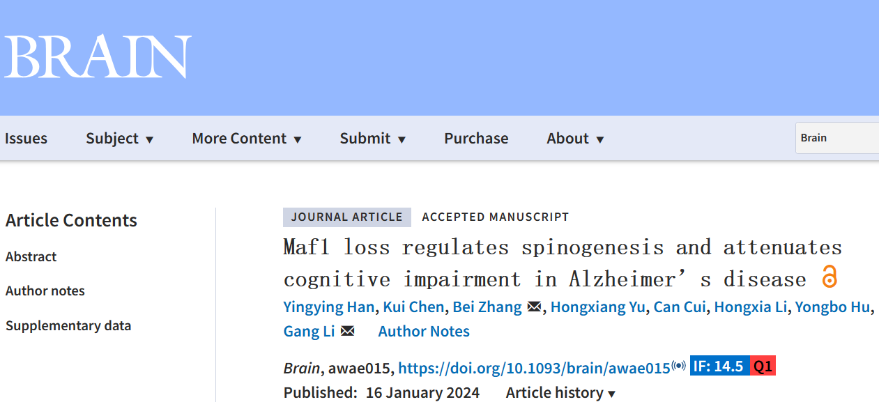 相关研究成果于2024年1月16日在线发表在Brain杂志上。李刚教授为通讯作者,张贝博士为共同通讯作者,课题组韩颖颖博士为第一作者。