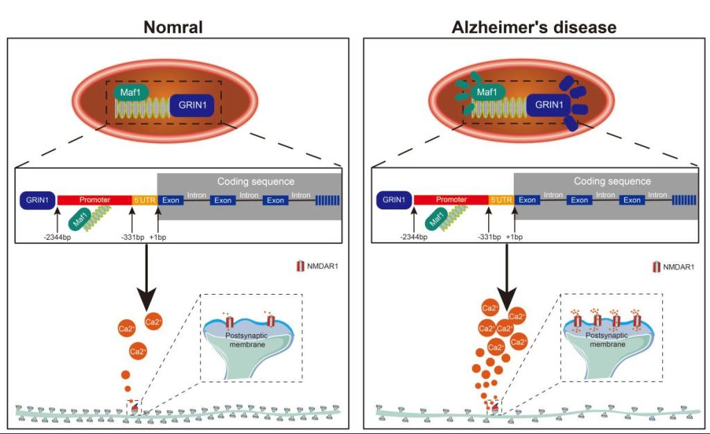 总的来说,研究人员表明,转录调节因子Maf1在AD中表达增加,通过与Grin1的启动子区结合,调节NMDAR1的表达,进一步调节钙稳态,改变树突棘的形态结构和数量,从而影响突触功能。最终,它调节突触重塑并影响学习和记忆功能(图7)。