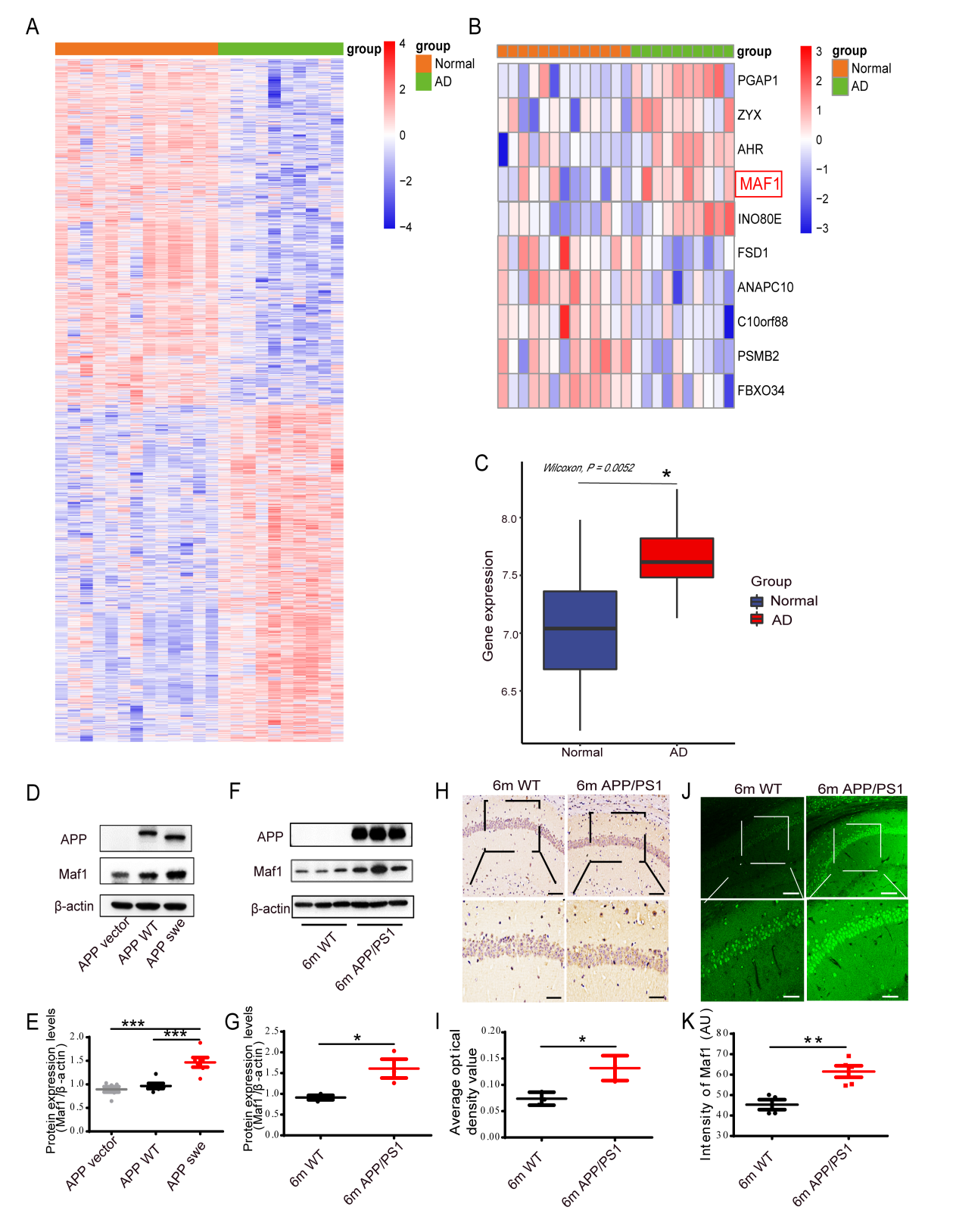 研究人员通过对人脑GEO数据库GSE5281进行基因组研究,找到AD与正常海马组织之间的所有差异基因,发现在AD患者海马中Maf1的表达水平有显著升高趋势。同时原代海马神经元AD模型与APP/PS1小鼠海马中Maf1蛋白水平均显著升高。(图1)。