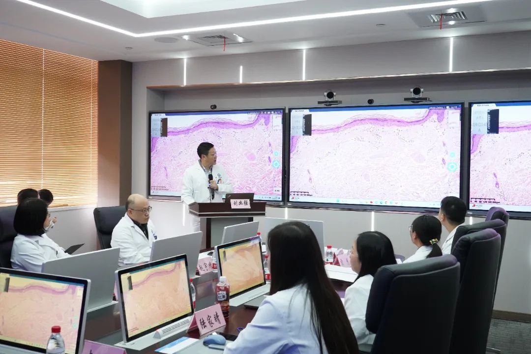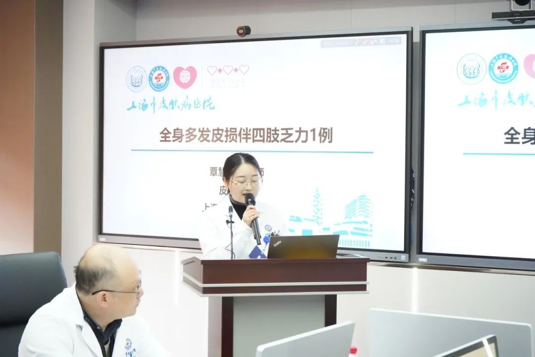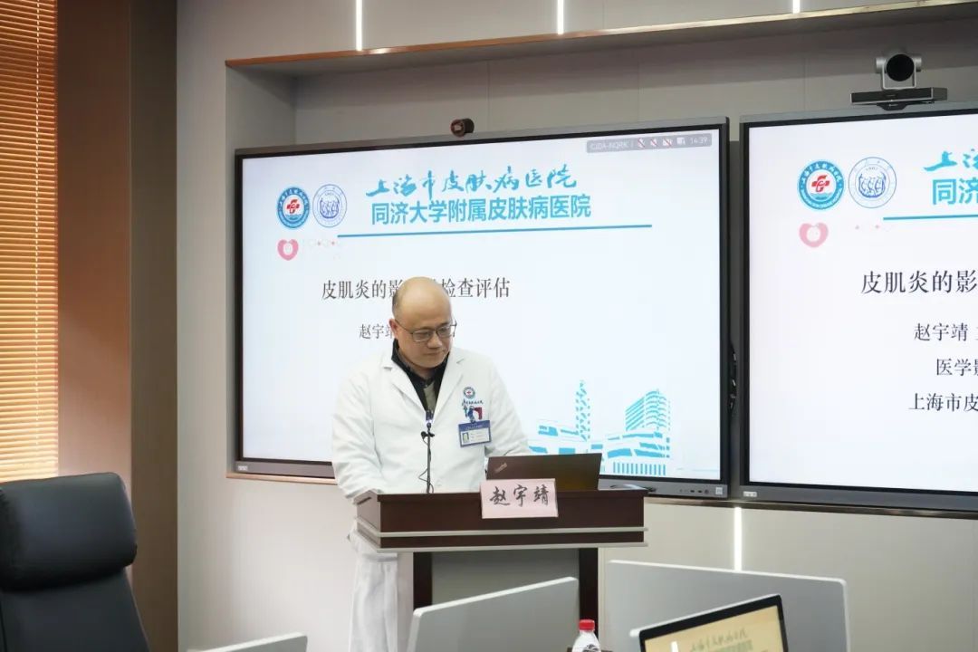 此次示范教学采用线下教学互动联合线上观摩学习形式,来自皮肤内科、病理科、风湿免疫科、医学影像科等多学科专家团队围绕一例皮肌炎病例展开讨论。本次教学活动由皮肤科住培基地主任史玉玲教授主持,二十余名住院医师规范化培训基地住培学员线下参加了此次教学活动。