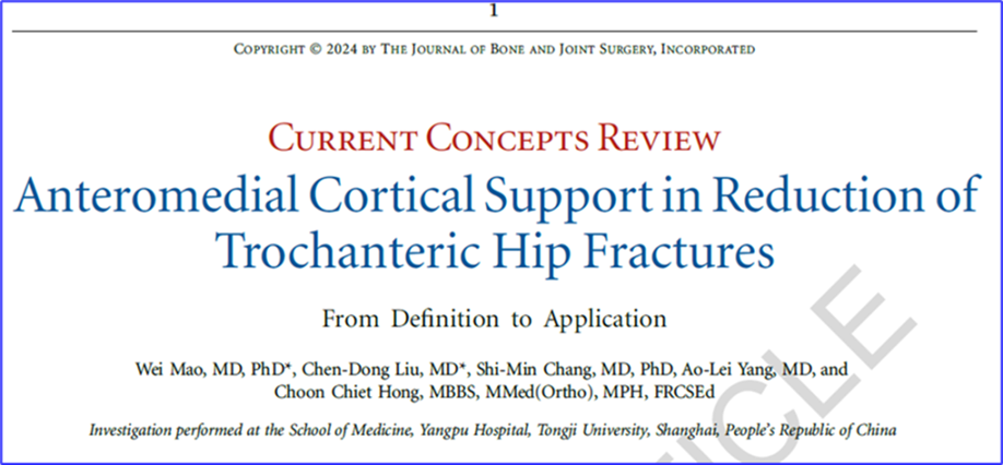2024年4月29日,JBJS发表了太阳成集团tyc33455cc官网附属杨浦医院骨科张世民教授团队的特邀约稿综述论文,即Current Concepts Review (CCR),以介绍我校原创骨科手术理论:髋部转子间骨折“前内侧皮质支撑”理论与“张氏复位标准”。该综述论文标题为Anteromedial Cortical Support in Reduction of Trochanteric Hip Fractures: From Definition to Application(股骨转子间骨折的前内侧皮质支撑复位:从定义到应用)