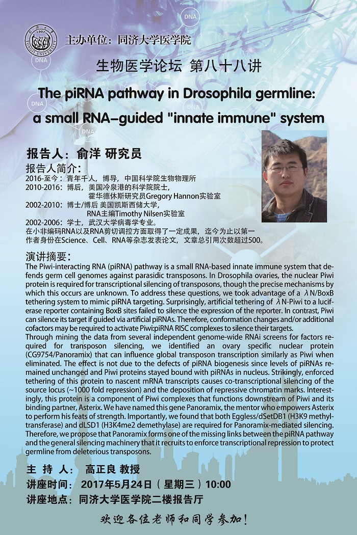 生物医学论坛第88讲:The piRNA pathway in Drosophila germline: a small RNA-guided "innate immune" system