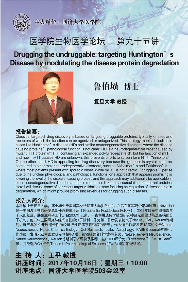 生物医学论坛第95讲:Drugging the undruggable: targeting Huntington’s Disease by modulating the disease protein degradation