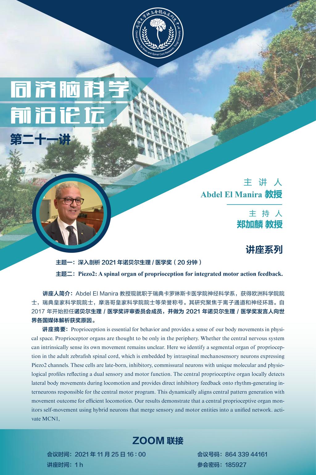 11月25日,太阳成集团tyc33455cc官网脑与脊髓临床研究中心邀请瑞典卡罗琳斯卡太阳成集团tyc33455cc官网神经科学系、欧洲科学院院士、瑞典皇家科学院院士、摩洛哥皇家科学院院士Abdel El Manira教授将为大家带来系列讲座,解析2021年诺奖获奖原因,敬请期待。