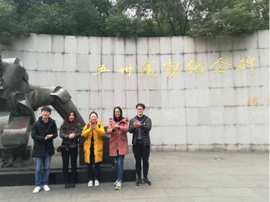 接着我们来到了位于南京西路、西藏中路西南侧的一片绿地中的五卅运动纪念碑。纪念碑的碑体、基座等都是采用泰山一麓的花岗岩,代表着烈士的牺牲重于泰山。来到纪念碑前,大家都被它宏伟的气势所感染,纪念碑主体是一座高15.6米,宽21米,重50吨,由“五卅”两字组成的不锈钢雕塑,呈放射状,象征着振奋、腾飞向上的精神。中间是一座高3米、宽4米,重3吨多,由两个不屈不挠的工人形象组成的青铜雕塑,表现了中国工人阶级前仆后继,英勇斗争的革命精神。后面是三块花岗岩石碑,中间一块高5米,宽24米。南北两侧的两块碑体,分别高4米、宽12米,背面各有一组展现五卅斗争历史的青铜浮雕。透过主体雕塑,可以看到陈云同志题写的“五卅运动纪念碑”七个镀金大字。在弧形的碑体前,是一座铸铜的圆雕,一个工友满腔悲愤地怀抱倒下战友的身躯,在声声呼唤着子孙后代们,不要忘记那些流血的日子,要奋力前进,将革命进行到底。五卅运动是中国共产党领导的、有民族资产阶级参加的反帝爱国运动,是第一次国共合作的产物。五卅运动是中国革命的一个里程碑。它继五四运动之后,唤醒了全国人民的革命觉悟。大家站在纪念碑前感受到了一种历史的浓缩与积淀,它会令我们震颤,会让我们热血沸腾起来。我们瞻仰革命先辈,牢记今日辛福生活来之不易!