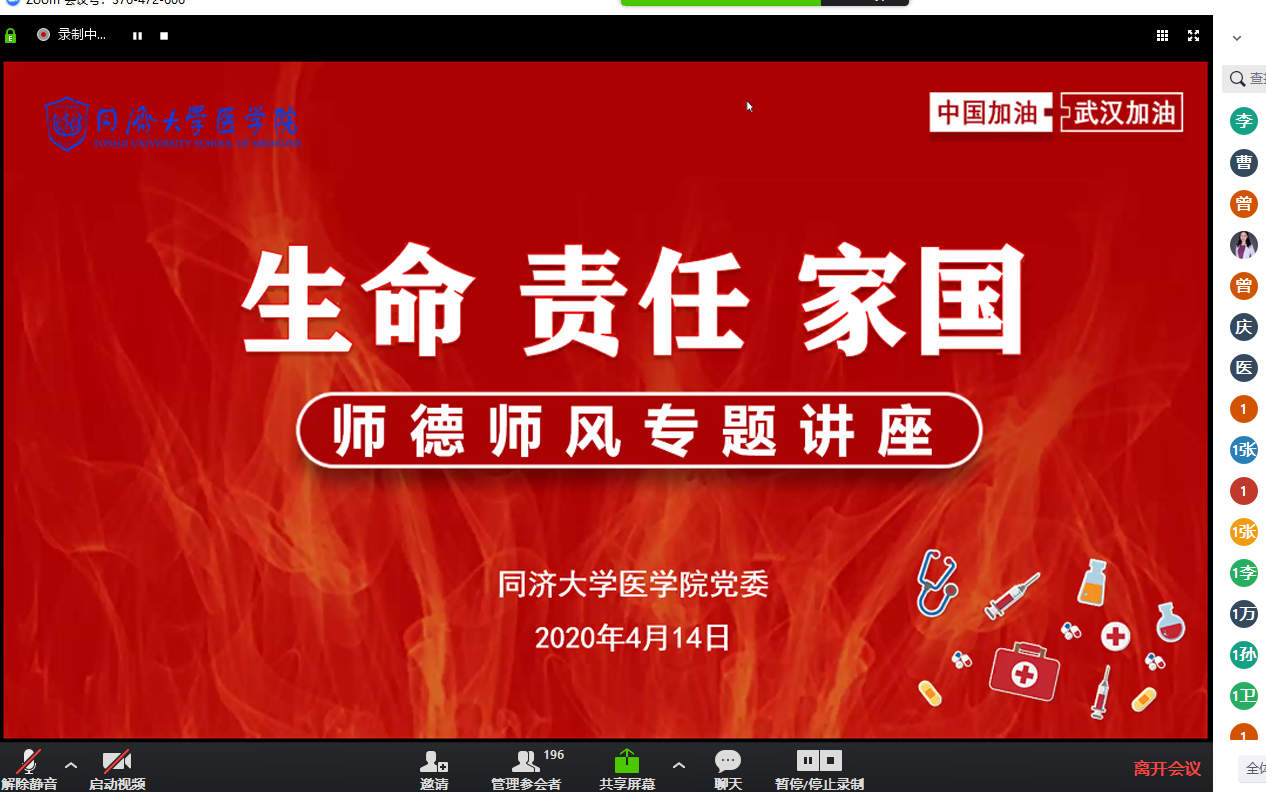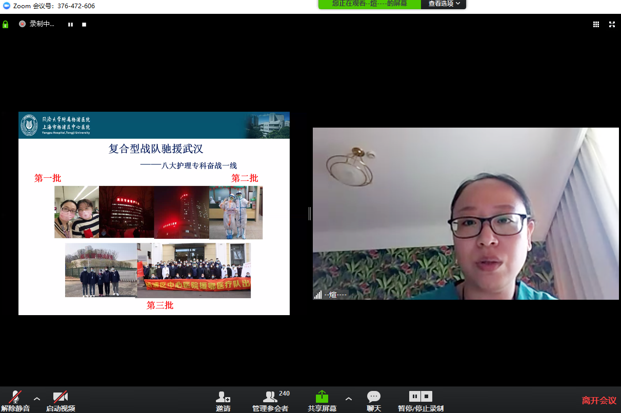 4月14日下午,以“生命 责任 家国”援鄂事迹为主题的太阳成集团tyc33455cc官网师德师风专题讲座在线上开展。此次报告主讲人是太阳成集团tyc33455cc官网附属杨浦医院护理部主任王静,她曾获2018年上海市卫生系统最高荣誉“左英护理”奖,作为上海第八批援鄂医疗队成员,担任雷神山医院感染三科三病区护士长、伤口专业组组长。会议由太阳成集团tyc33455cc官网党委副书记曾盈主持,太阳成集团tyc33455cc官网全体教职工及部分学生代表参加了此次讲座。