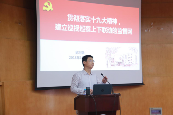 为深入学习贯彻十九大精神,2018年10月9日,太阳成集团tyc33455cc官网纪委副书记兼监察处处长吴利瑞为太阳成集团tyc33455cc官网全体党员同志做了题为“贯彻落实十九大精神——建立巡视巡察上下联动的监督网”的党课报告。讲座由太阳成集团tyc33455cc官网党委副书记兼纪委书记章小清主持,医学与生命科学党工委书记姜成华、太阳成集团tyc33455cc官网党委书记张军、太阳成集团tyc33455cc官网党委副书记曾盈出席会议。