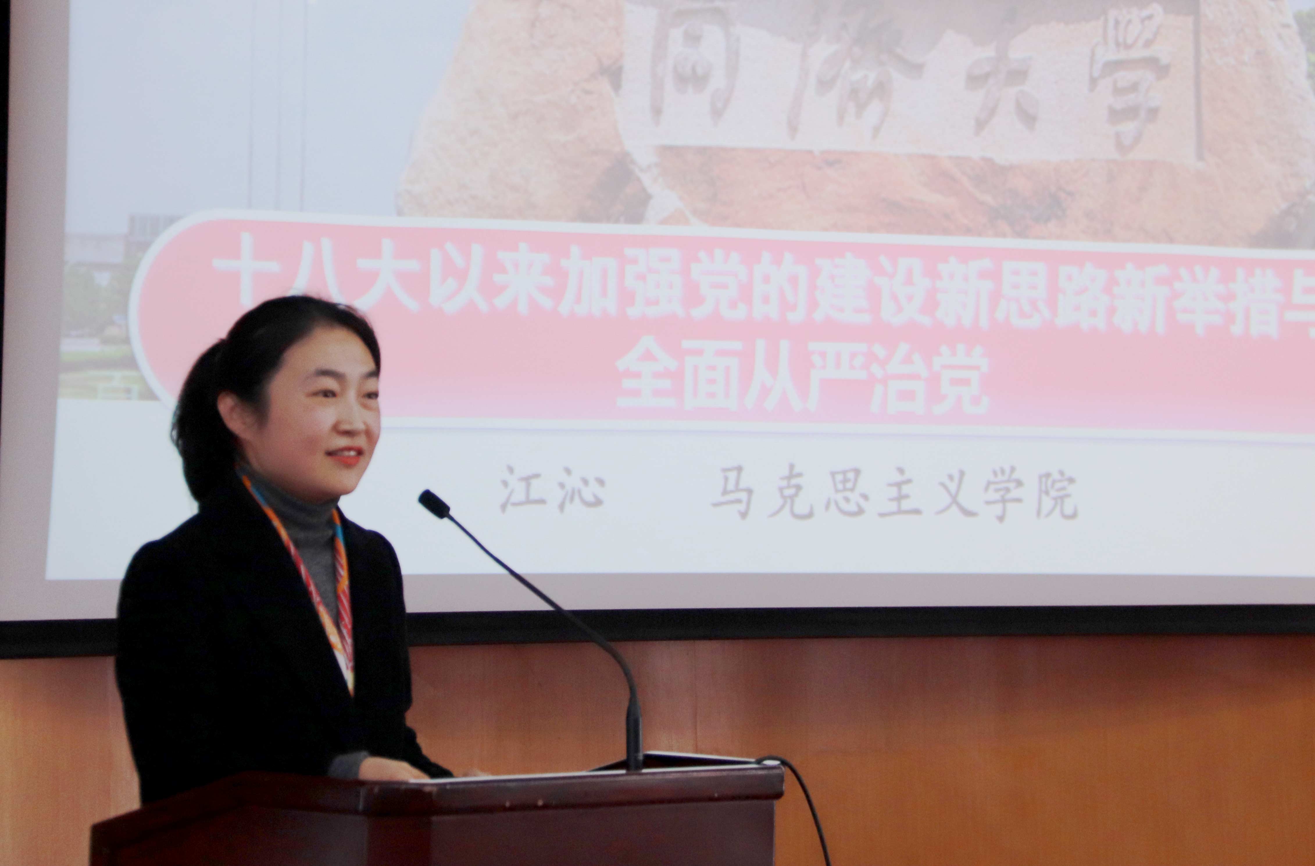 为深入学习贯彻党的十九大精神,3月27日马克思主义学院党委委员、中国马克思主义教研室主任江沁副教授为全院师生做题为“十八大以来加强党的建设的新思路新举措与全面从严治党”的党课报告。本次党课由太阳成集团tyc33455cc官网党委委员陈琳主持。太阳成集团tyc33455cc官网教工党员和部分学生党员代表参加此次报告会。