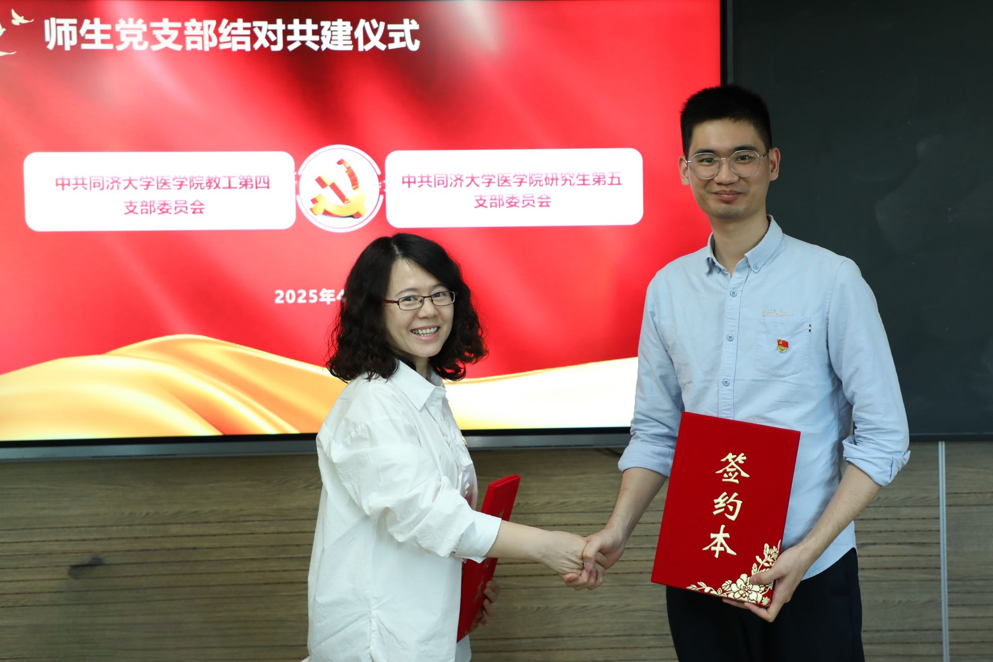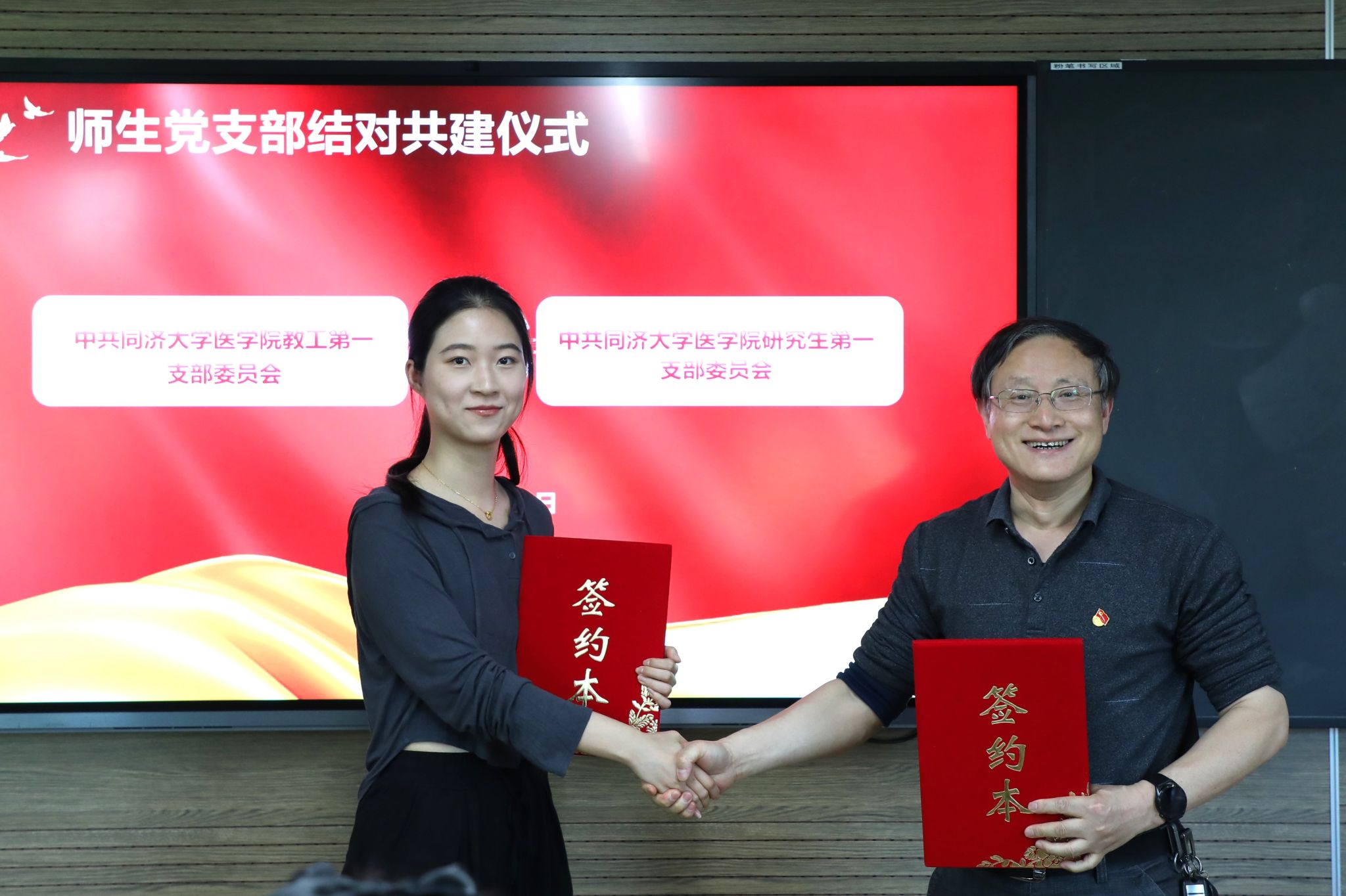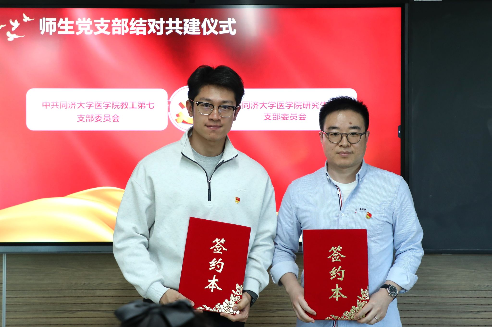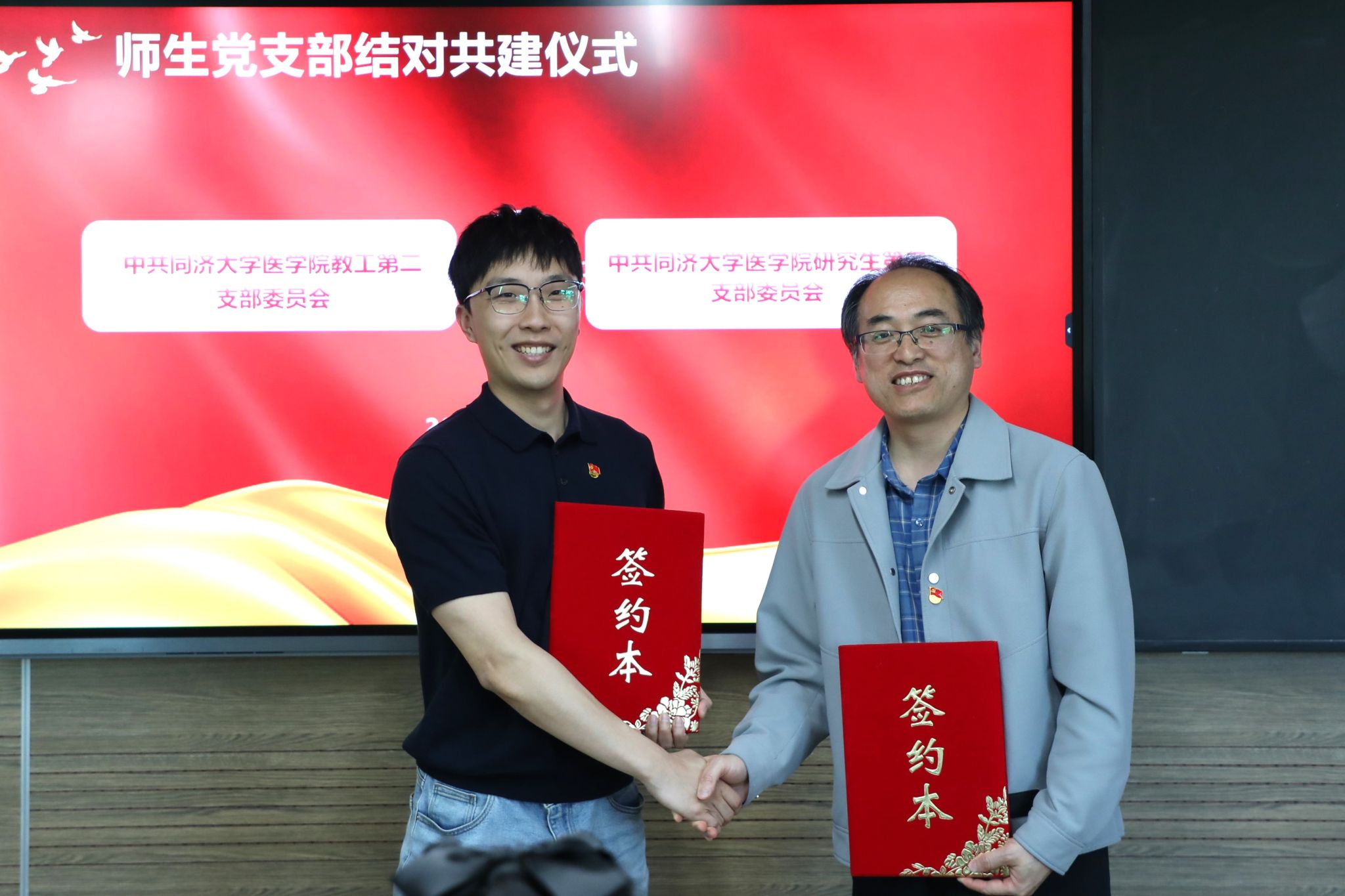 随后,举行了教工党支部与基础博士研究生党支部的结对共建仪式。双方支部书记签署了共建协议,并合影留念。在结对共建的框架下,学院的师生党支部将遵循协同育人、共享双赢、可持续发展的原则,致力于探索并建立一个优势互补、资源共享的师生党建共建育人机制。