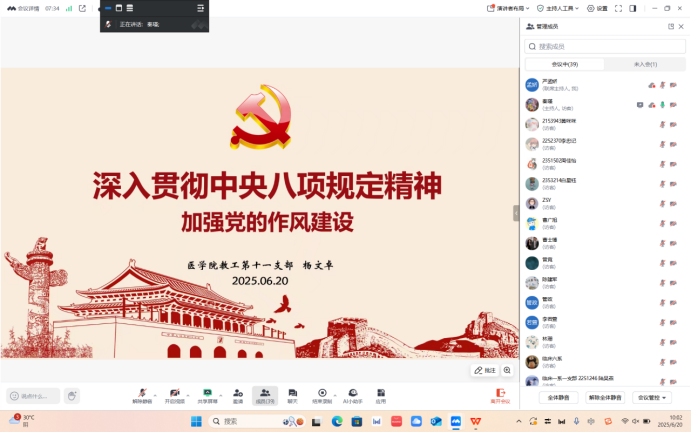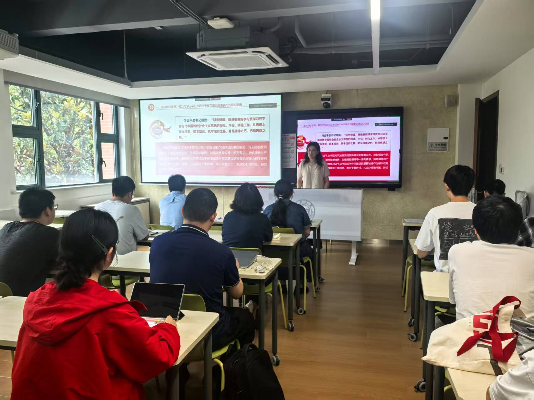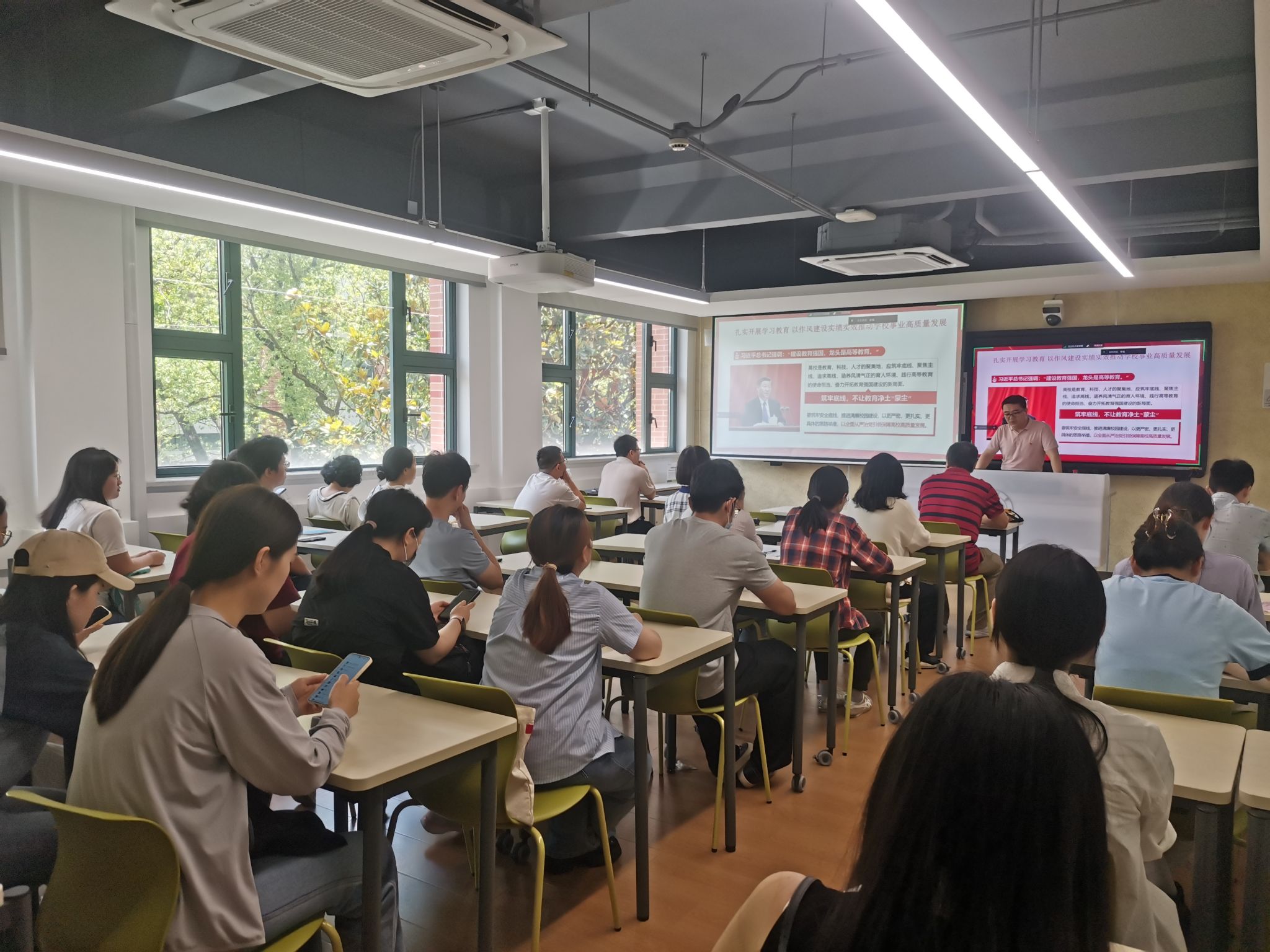副院长宋建人的党课主题为《正校风强教风优学风,锲而不舍落实中央八项规定精神》。宋建人从落实中央八项规定精神的意义;研究生教育全链条管理;非全日制研究生教育;研究生教学教改新进展;研究生教育工作展望五个方面进行分享。