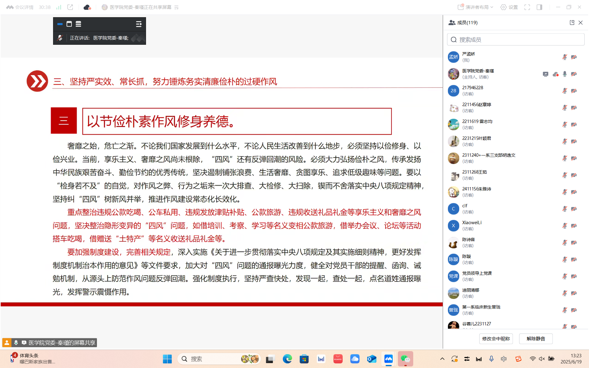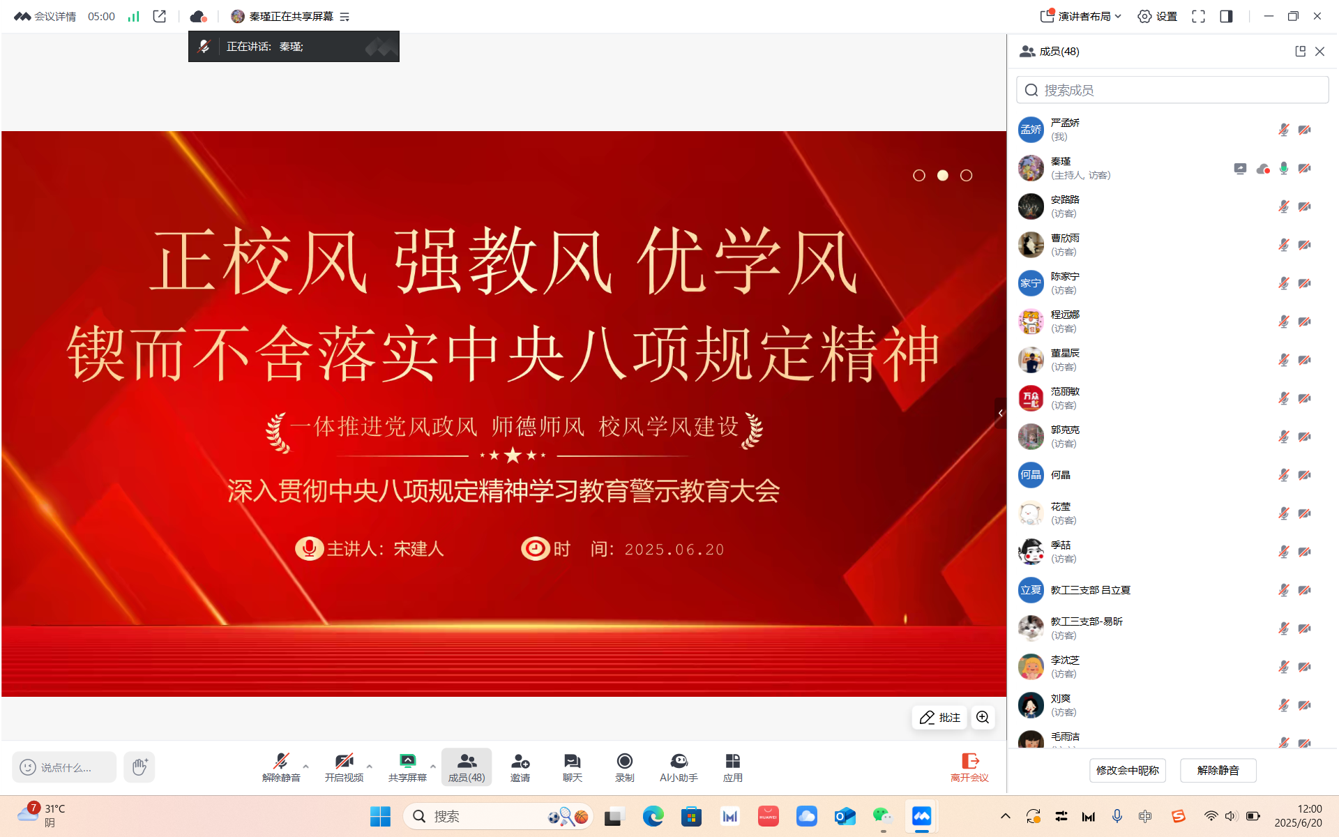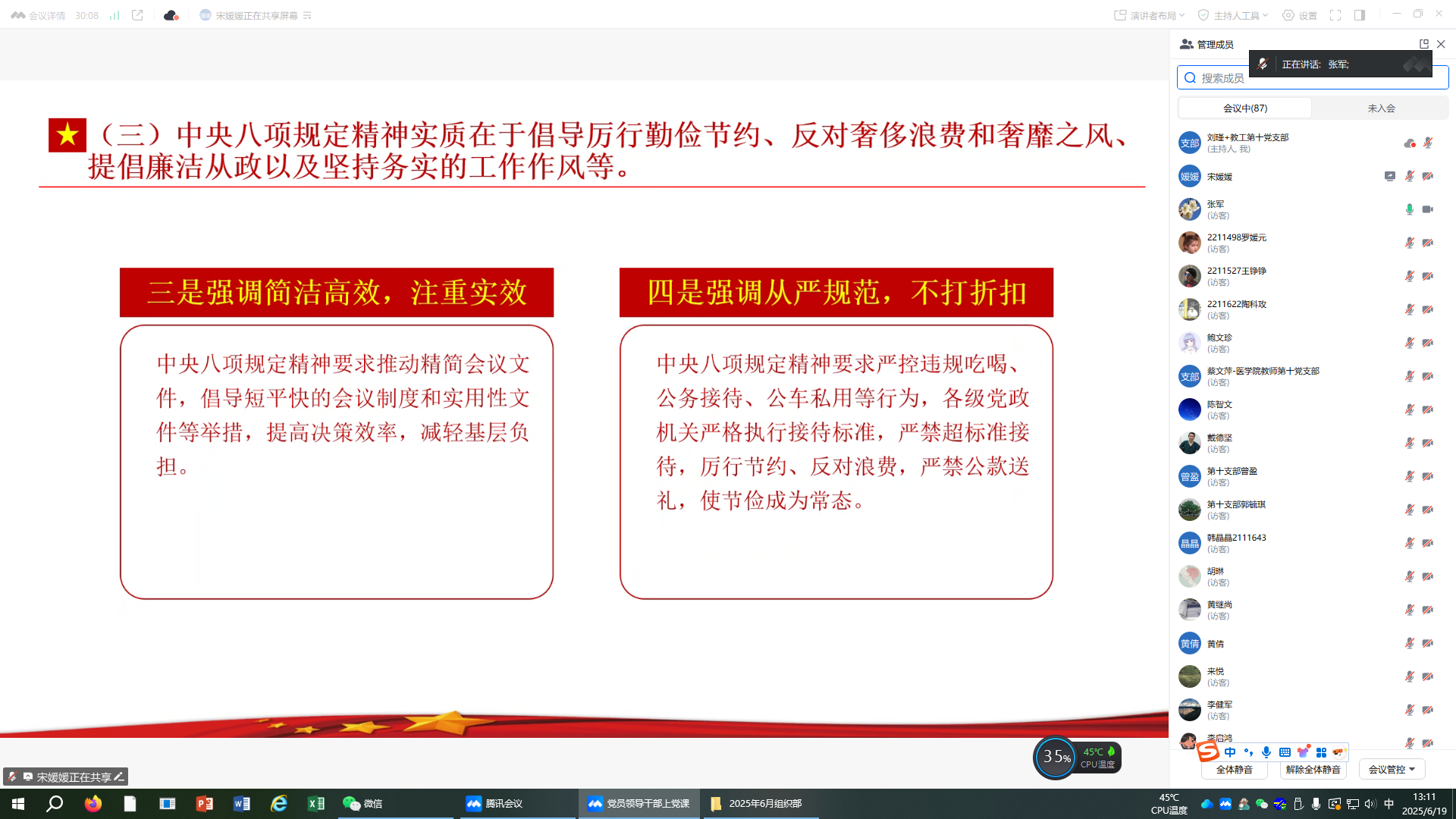 副院长宋建人的党课主题为《正校风强教风优学风,锲而不舍落实中央八项规定精神》。宋建人从落实中央八项规定精神的意义;研究生教育全链条管理;非全日制研究生教育;研究生教学教改新进展;研究生教育工作展望五个方面进行分享。