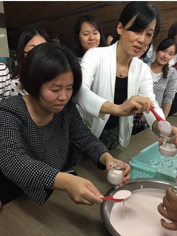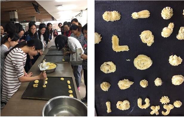 烘焙活动开始后,我院教职工在专业的烘焙师傅指导下,进行了现学现做曲奇饼干和奶冻两种类型的烘焙体验。